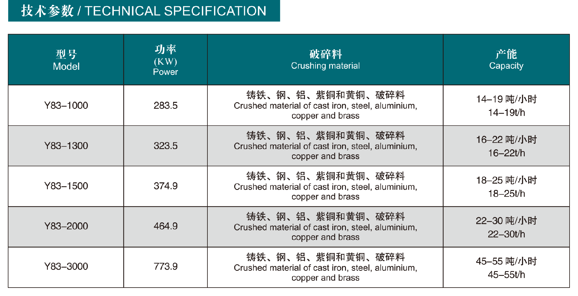 本公司生產(chǎn)的Y83系列立式壓餅機(jī)和臥式雙主缸壓餅機(jī)是為加工處理大量破碎料的高性能機(jī)器, 破碎料包括鑄鐵、鋼、鋁、紫銅和黃銅, 另外, 也可以處理研磨漿與金屬碎屑的混合物。